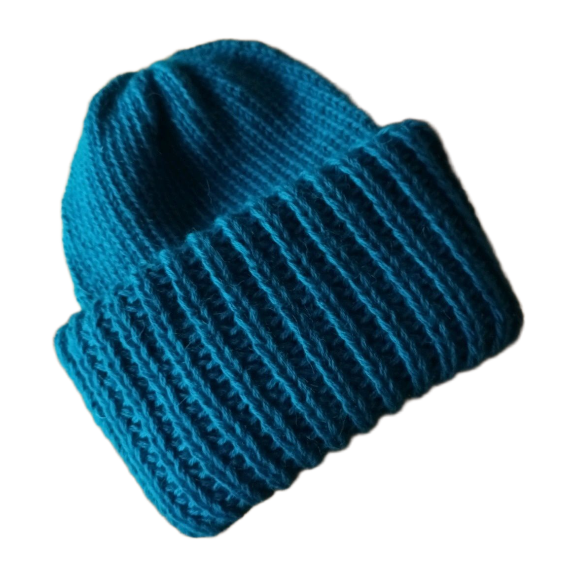 Uusi käsin neulottu muhkea pipo kahdesti taitettavalla reunuksella. Väri on kirkkaan turkoosi ja sävy on todellisuudessa ehkä aavistuksen vihreämpi kuin kuvissa. Kokonaispituus taitteet avattuna noin 44 cm, riittää hyvin kahteen taitteeseen. Taitteiden leveyttä säätelemällä voi säädellä pipon korkeutta käytössä. Leveys venyttämättä 18-20 cm. Kuvattu ympärysmitaltaan noin 57 cm päässä. #knitwear #beanie #chunkybeanie #winter
