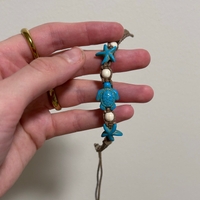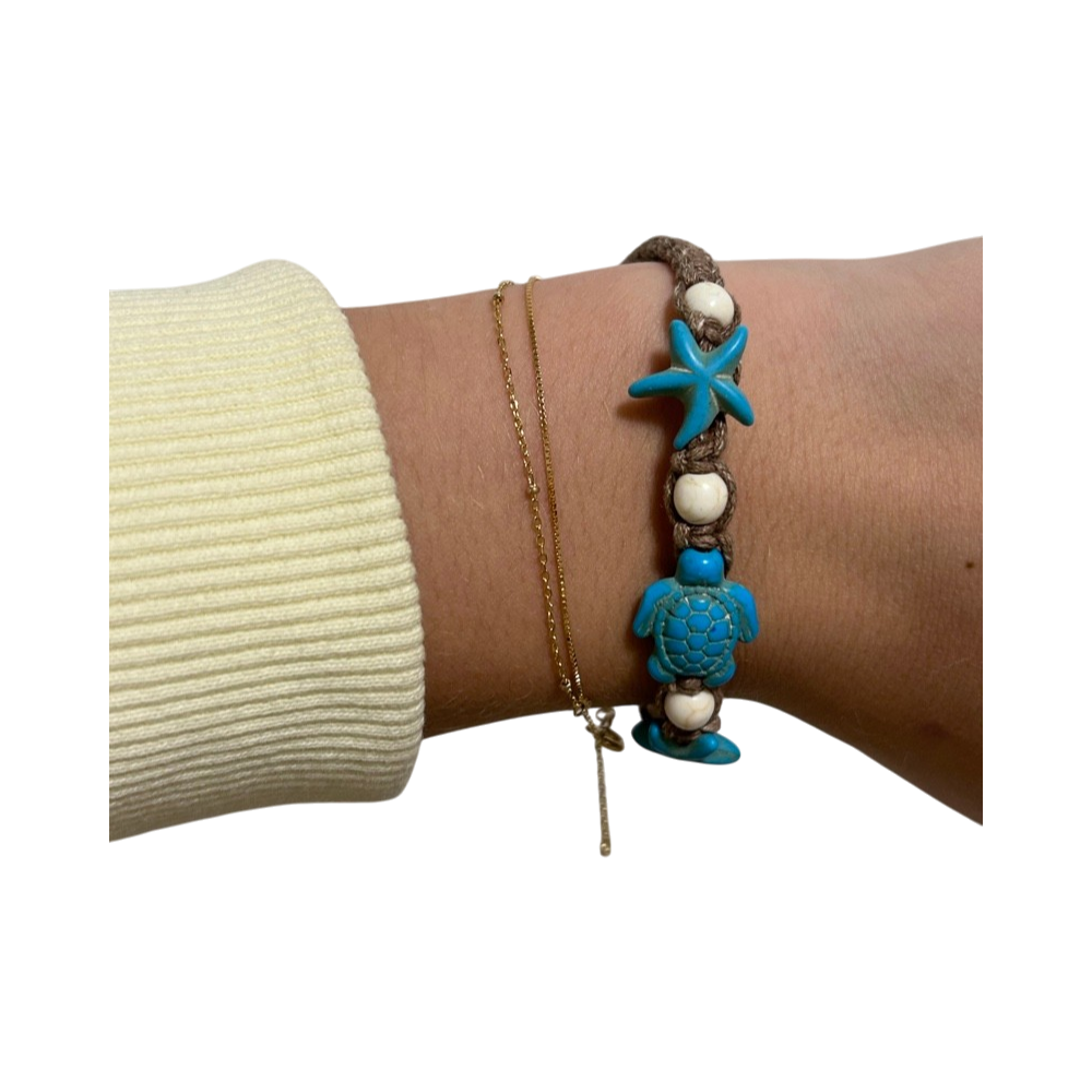 Handmade macrame bracelet with turquoise turtle and starfish charms.