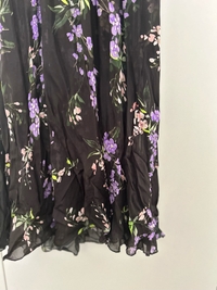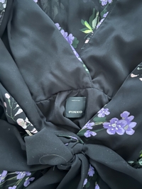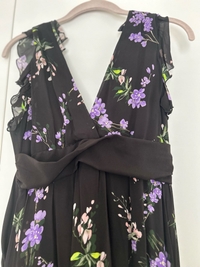 Naisten musta mekko violetilla kukkakuviolla ja vyöllä