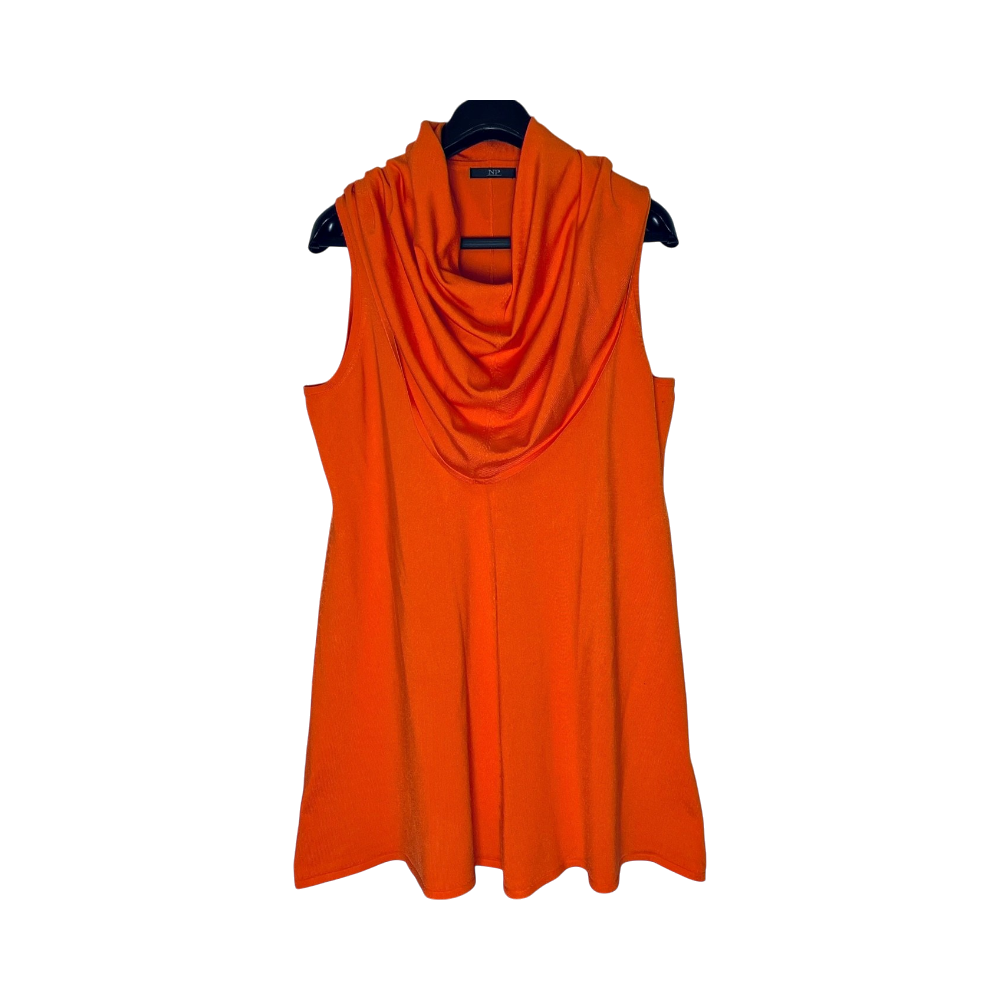 Almost like new shawl-collar sleeveless stretchy A-line NP tunic. Size/material/washcare tags removed, but I would guess the material is maybe viscose knit (?). Size probably XL-XXL. Length nape seam to hem 83 cm, shoulder width 35 cm, width at armpit 55 cm (stretches up to max 70 cm), hem width 85 cm. Neckline width approx. 28 cm, collar length 48 cm, collar "hem" width approx. 70 cm.