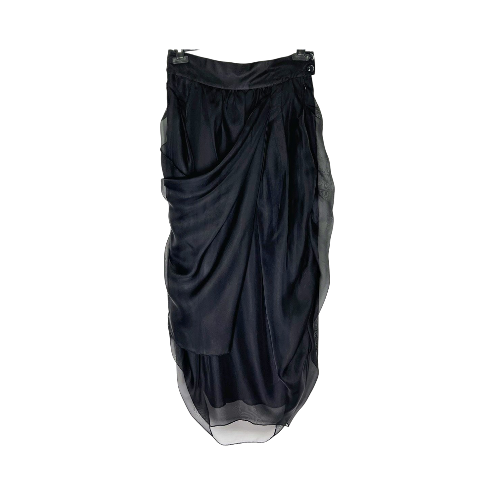 Tulip-shaped gorgeous layered chiffon skirt, size 40. Made in Finland. Outer fabric 100% polyester, lining 100% polyamide. Hand wash 30C. Wide 6cm waistband, on left side seam two buttons and a 20cm zipper. Waist width (note: not stretch) 38cm, length approx. 100cm. Otherwise neat and intact but at the hem on the side seams small approx. 3cm tears neatly and quite inconspicuously darned (see picture).