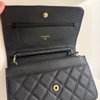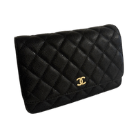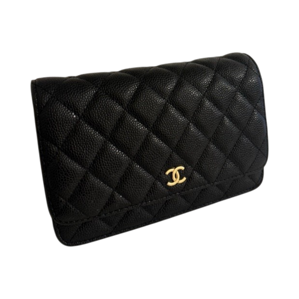 Pieni quiltattu nahkalaukku, kullanvärisellä CC-lukolla.