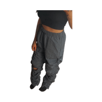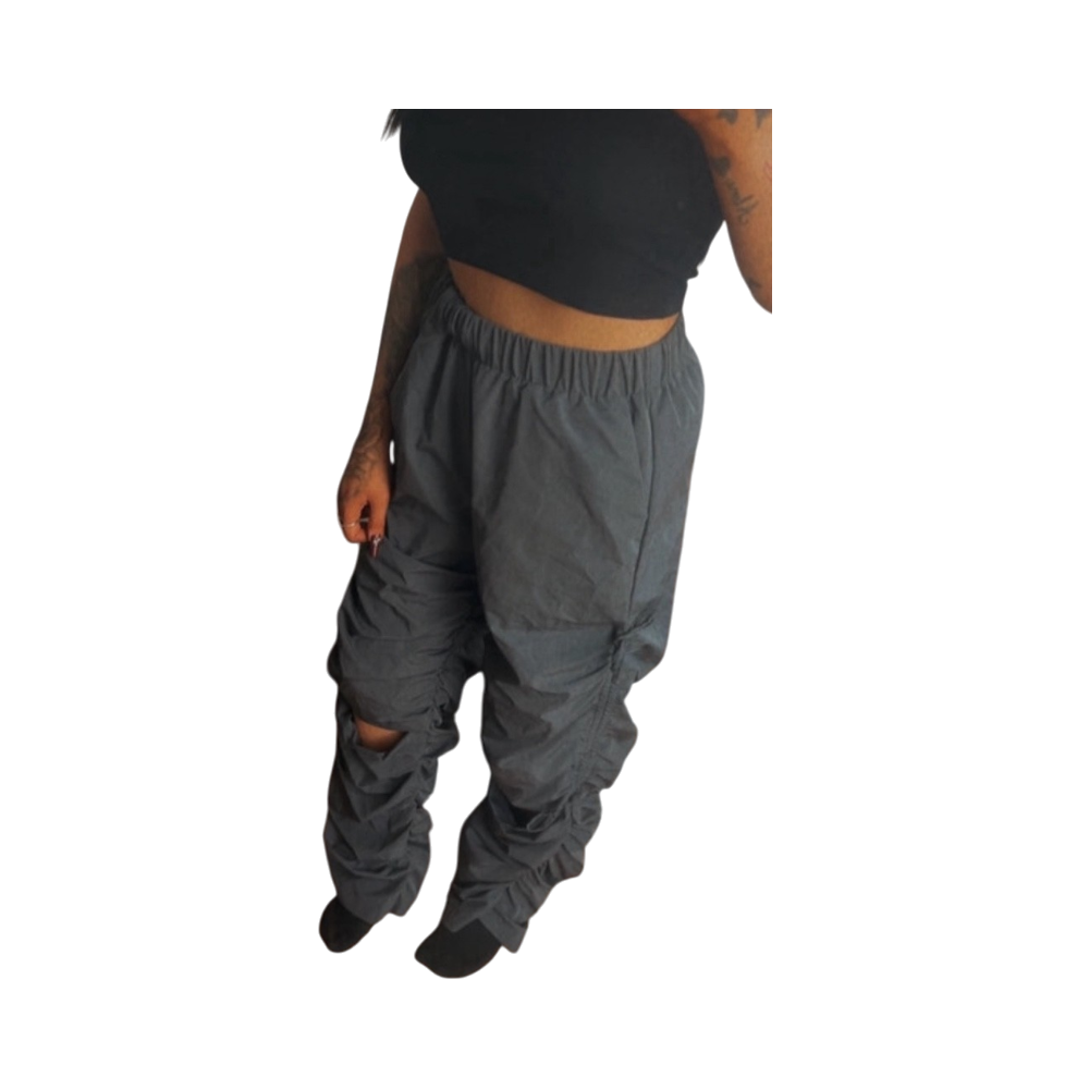 Grey ruched high-waist cargo-style trousers, relaxed fit. For rave example