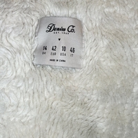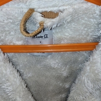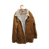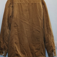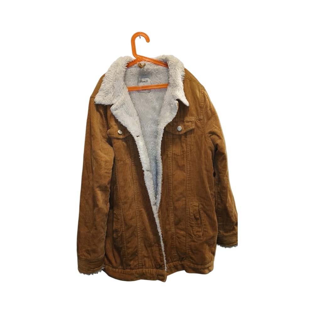 Pitkä ruskea corduroy-takki valkoisella karvavuorella. Karvavuori on tummentunut ajan myötä. Lapun vieressä on pieni reikä, se on revinnyt saumasta joten tosi helppo korjata.
