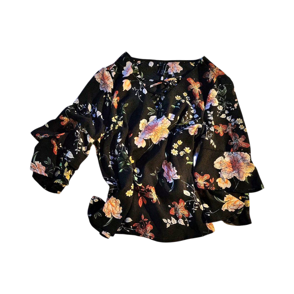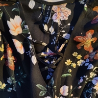 Uuden veroinen kukkakuosinen paita. Edessä tollaset narut jotka näkyy toisessa kuvassa.