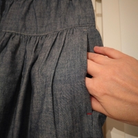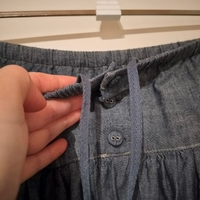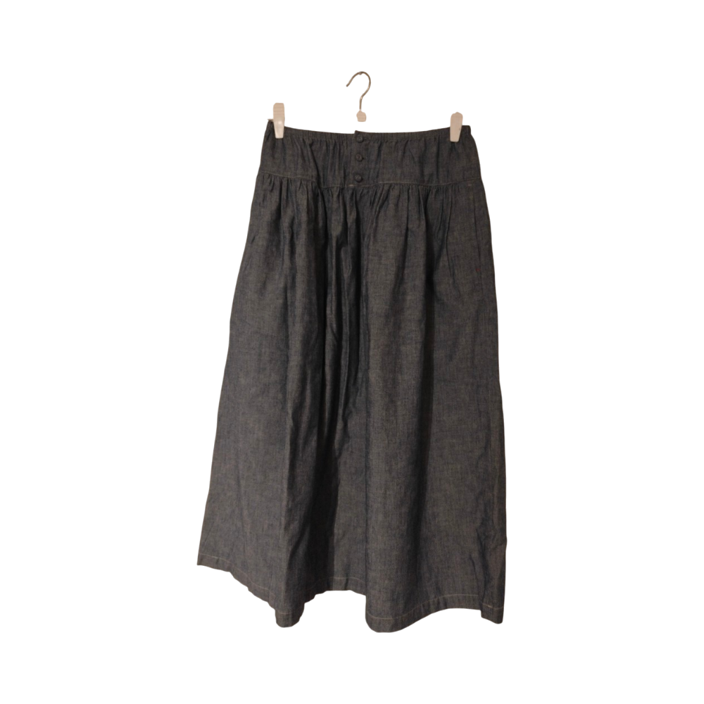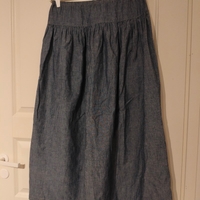 Sininen pitkä farkkumainen midihame, napit vyötäröllä, kiristysnauha ja kuminauha väljät laskokset. Hameessa kaksi sivutaskua. Hame puuvillaa. Jäänyt täysin käyttämättä, joten kunto uutta vastaava. Koiratalous. Voidaan tarvittaessa sopia myös noudosta akselilla Kerava-Korso.