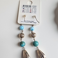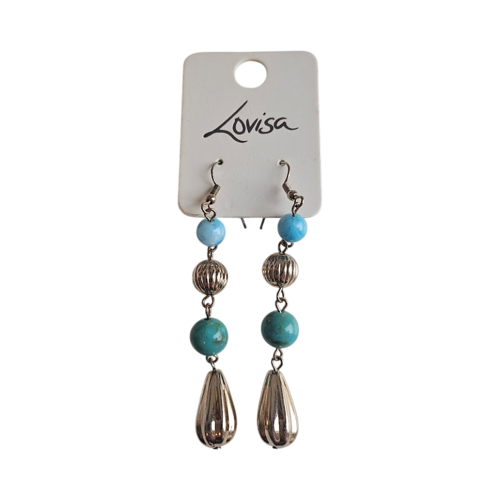 Long dangle earrings with turquoise beads and silver teardrops.