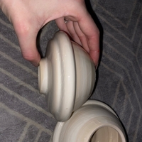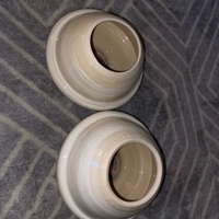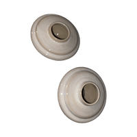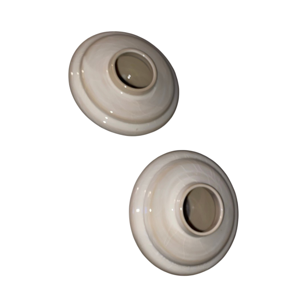 Kaksi pienikokoista beige-valkoista pyöreää maljakkoa.
