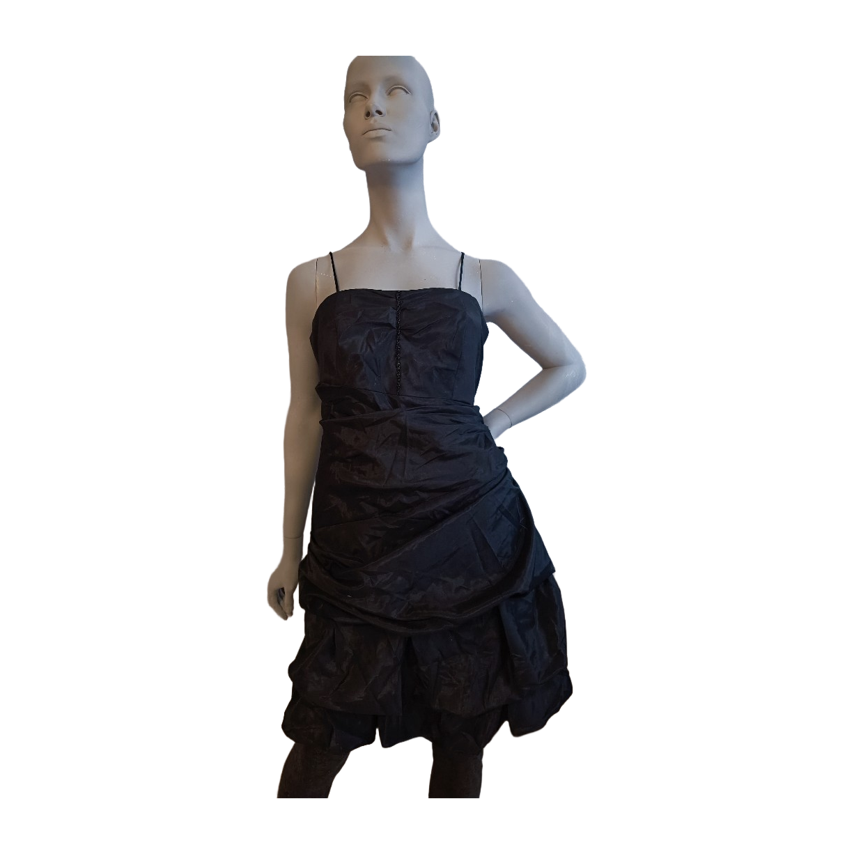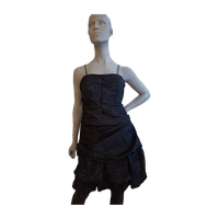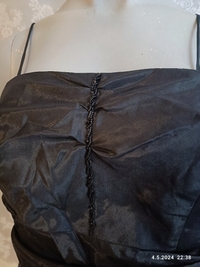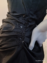 Thaimaassa teetetty mekko. Ei ole koskaan käytetty. Kyljessä piilovetoketju. Rypytyksiä ja helmi- ja paljettikorksteita. Myytiin silkkinä, mutta materiaalista ei ole varmuutta.