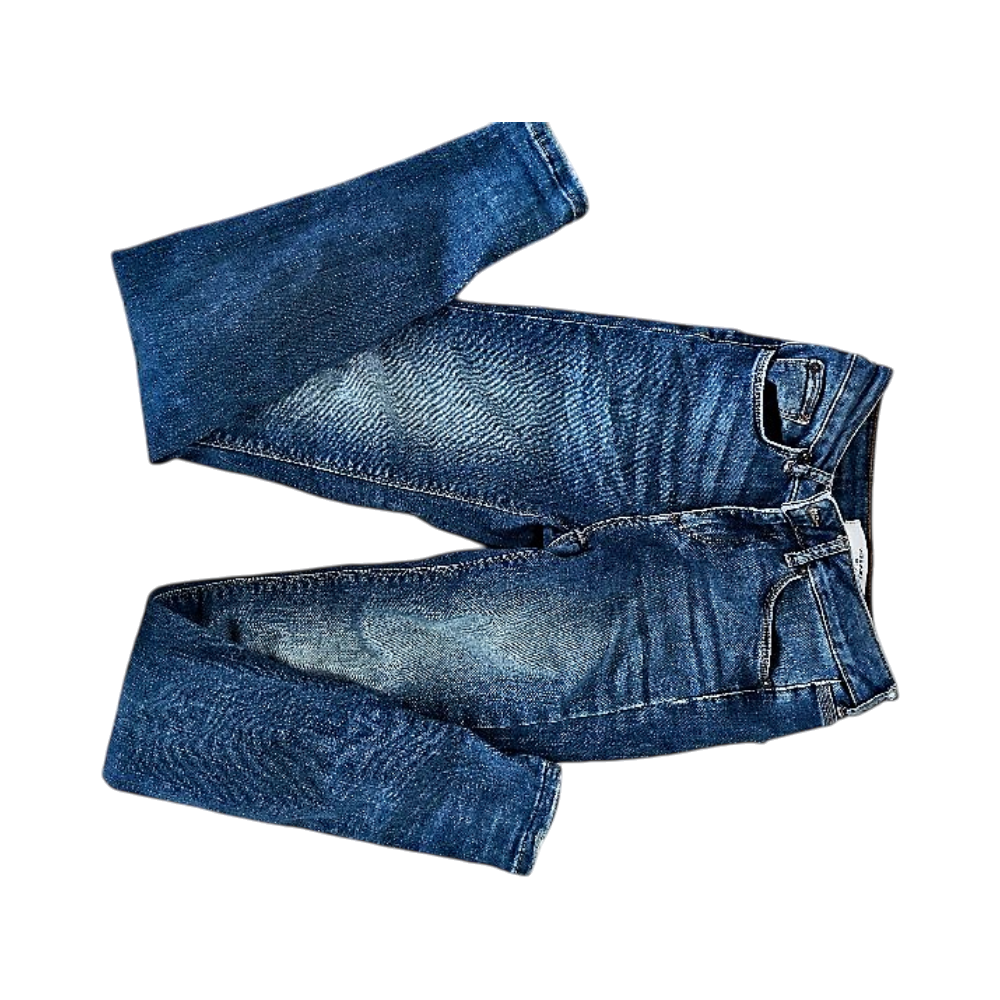 Tummansiniset farkut, kapea malli, kulutettu pesu, hyväkuntoiset. Vero moda jeans. Joustaa. Lahkeen suussa langan purkailua ja ommeltu takatasku kohdalla pieni repeämä. Kyvat