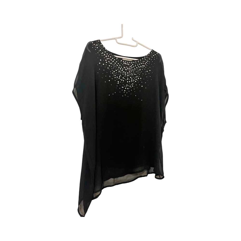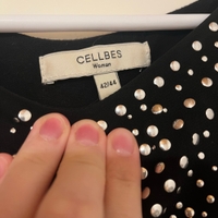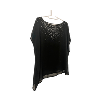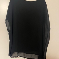 Musta pusero. Ylhäällä koristeellinen yksityiskohta. Koko 42/44. Kaikai n 50cm, pituus n 66cm. Eläintalous MMM, lisätietoja saa kysymällä