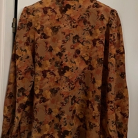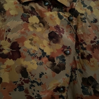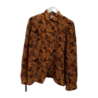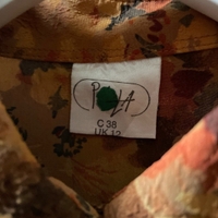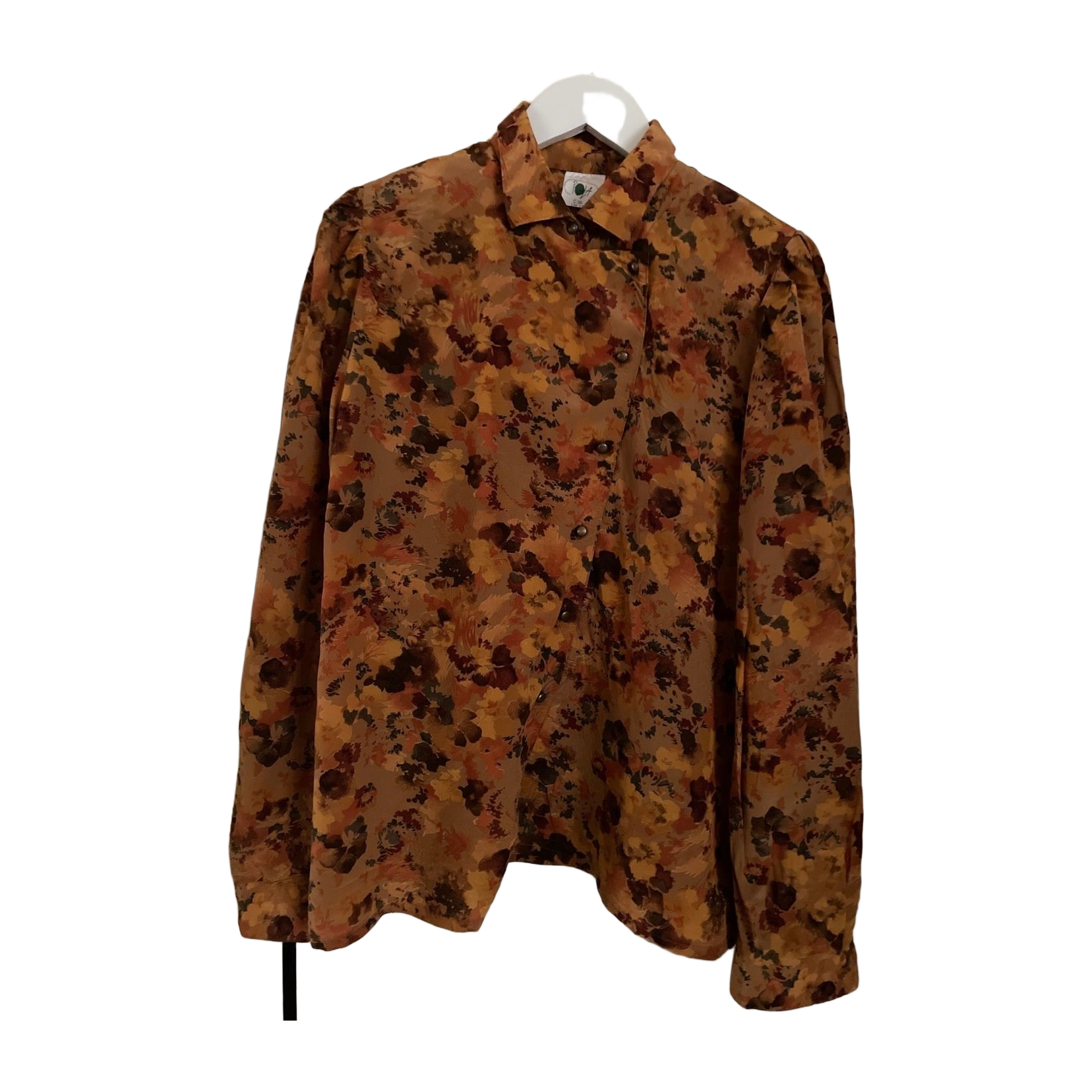 Pusero, jossa kangas on taidetta. Kauniit pronssin ruskeat ja oranssit sävyt. Olkatoppaukset, pussitettu hiha, kauniit yksityiskohdat.