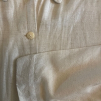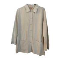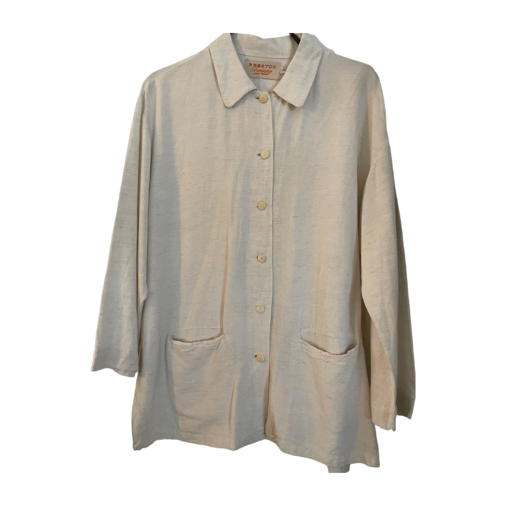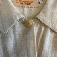 Ohuehko puuvillaa-pellavatakki vaaleaa beigeä kangasta. Edessä taskut. Perusvaate, reilu koko L.