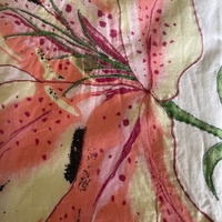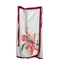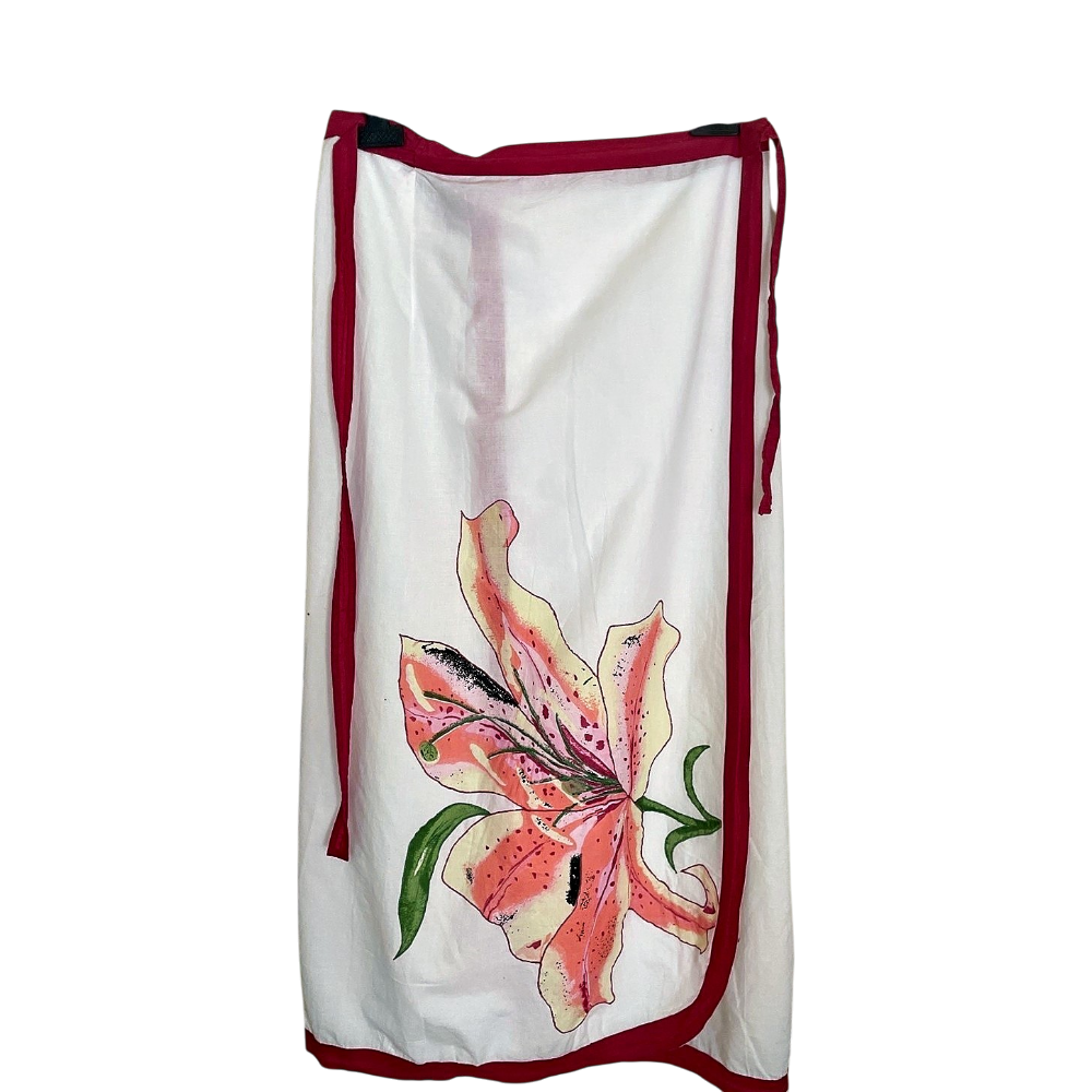 Kaunis kirjailtu/kankaaseen painettu kukkakoristeltu kevyt kietaisuhame rantakäyttöön; miksei helteiseen kaupunkiinkin.