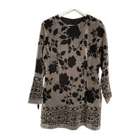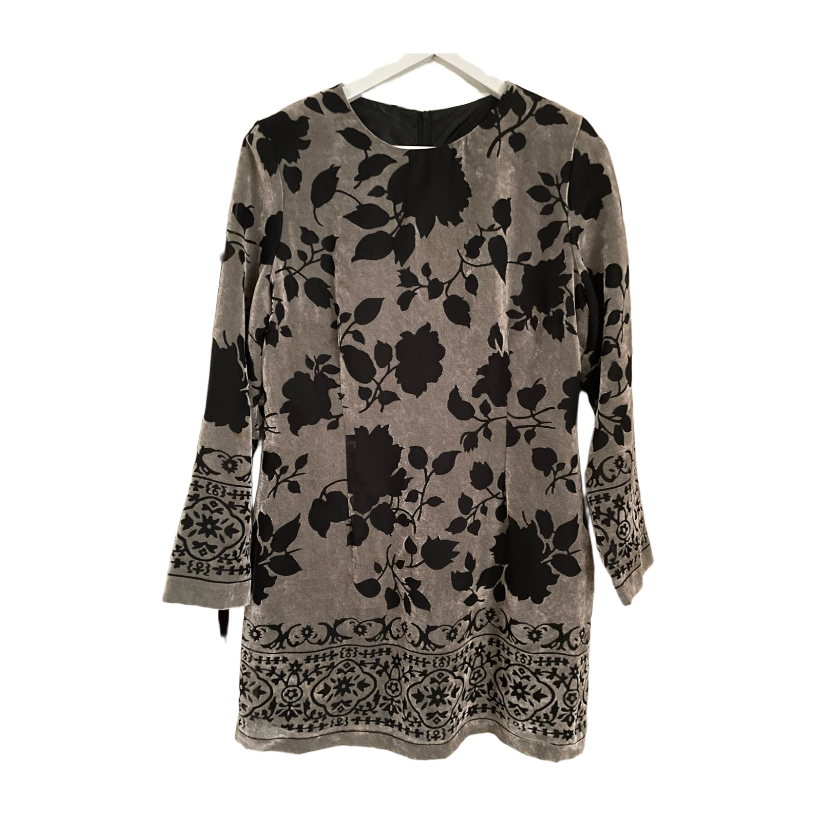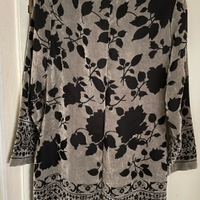 Kerran juhlissa muistaakseni 1998 tai -99 käytetty lyhyehkö mekko tai tunika. Kaunis hopeanharmaa sametti ja mustat matta kuviot. Pesulassa tämän yhden käytön jälkeen pesty, täysin virheetön ja siten kuin uusi.