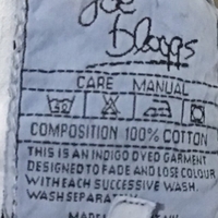 Ostettu ~1989/1990 Tukholmasta. Lyhyen aikaa olivat käytössä silloin, ei käytetty sen jälkeen. Lahkeet lyhennetty käsin harsimalla, joten periaatteessa niitä on mahdollista pidentää, mutta sisäpuolelta käänteestä löytyvät ainoat, normaalisti piiloon jäävät käytön jäljet: hieman ruskeaa väriä, joka ei ole irtolikaa (voi olla kenkälankkia, joka vuosien varrella jämähtänyt kiinni; ei lähtenyt äskettäin pesussa miedolla tahranpoistoaineella).