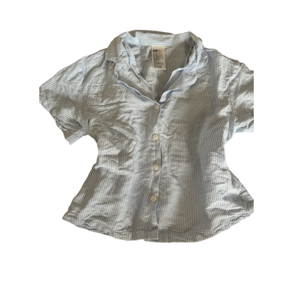Light blue and white striped short-sleeve button-up blouse. Pyjama shirt