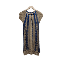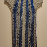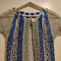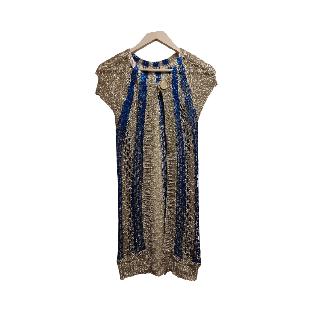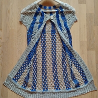 Ohut virkattu liivi, hopeaa ja sinisiä raitoja, yksinappinen. Pituus n. 75 cm.