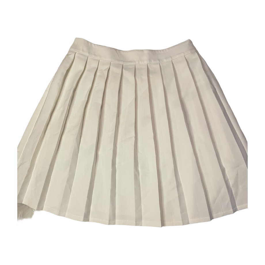 Valkoinen pliseerattu hame, lyhyt ja siisti malli.