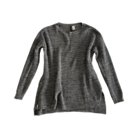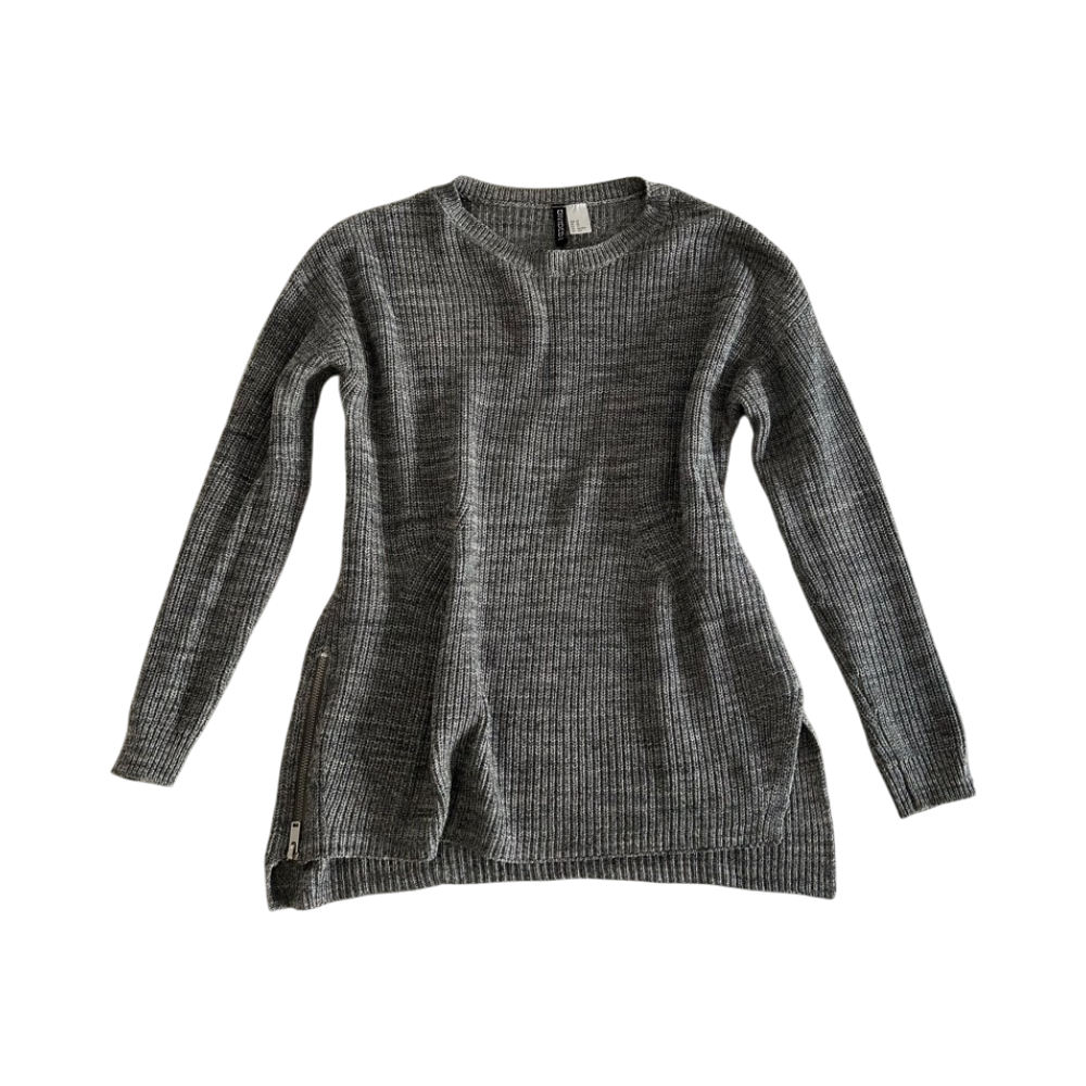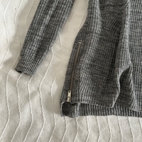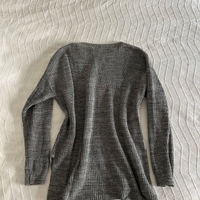 Harmaa villapaita. Sivuilla halkio ja toisella puolella vetoketju. Pitkä ja löysä malli.