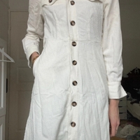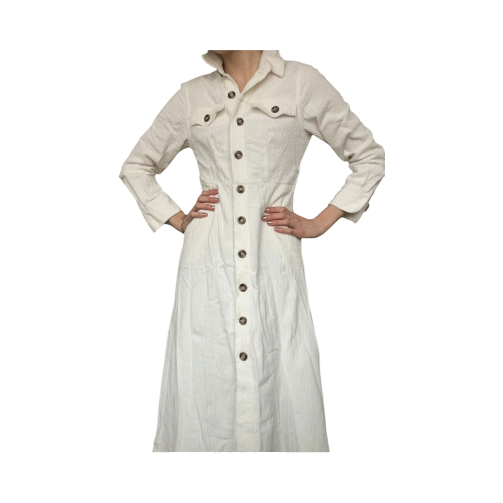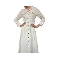 Long white button-up coat with chest pockets, casual fit.
