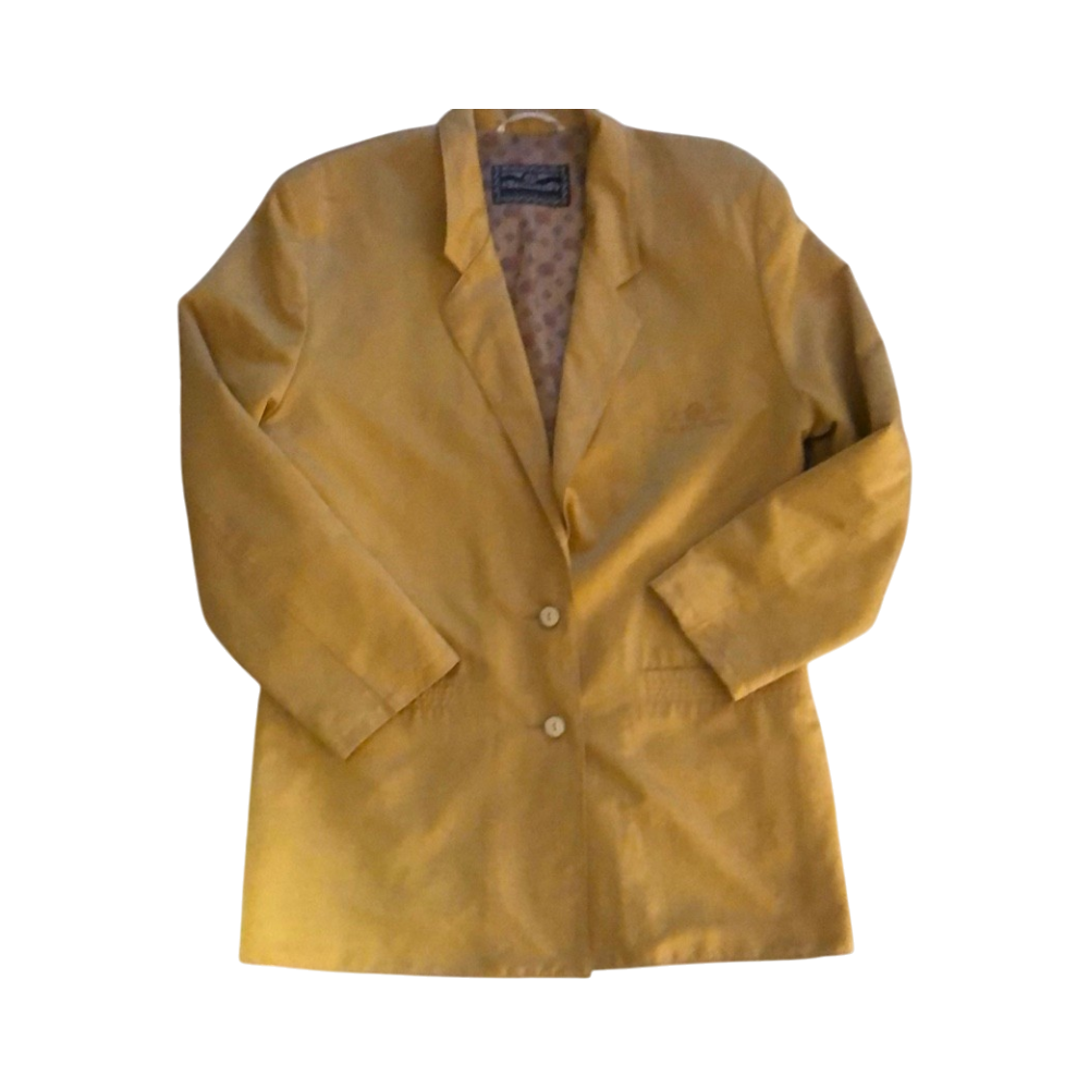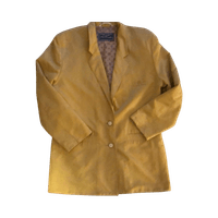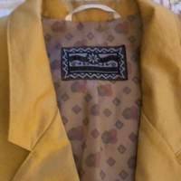 Keltainen naisten pitkä bleiseri, kaksi nappia, vuorillinen. Takissa kauluksessa tahraa olisko meikkivoiteesta en ole yrittänyt pestä huomioitu hinnassa