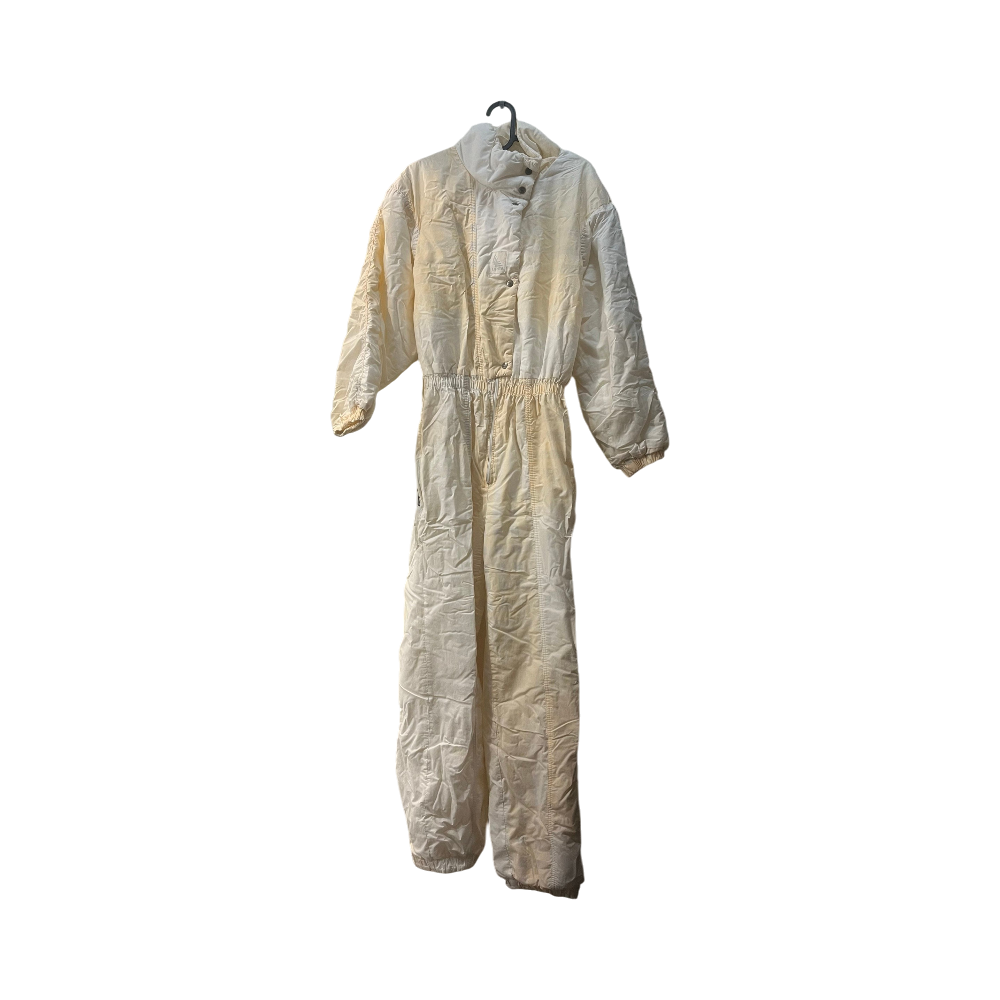 Cream padded body suit with elastic cuffs, zip pockets, insulated lining.
