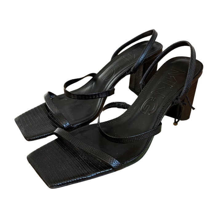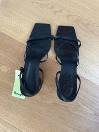 Elegant black sandals with thin straps and block heels.