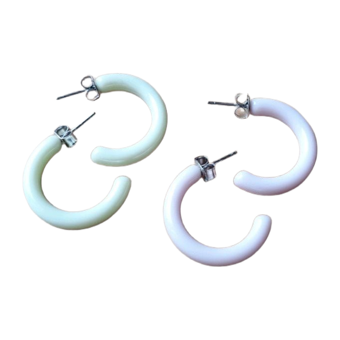 Kaksi paria käyttämättömiä korvakoruja. Väreinä vaaleanvihreä sekä vaaleanliila.