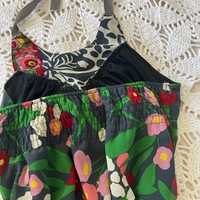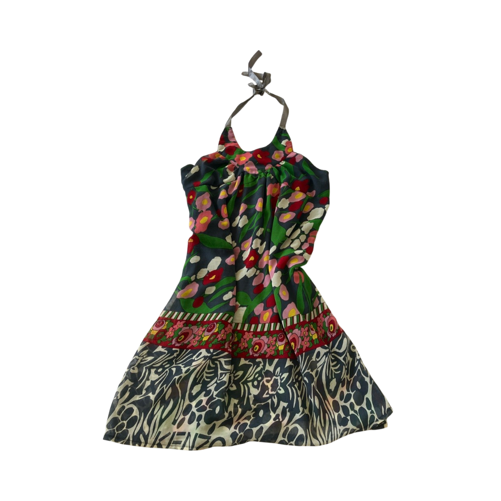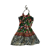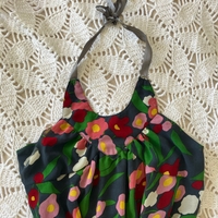 Sleeveless halter dress with colorful floral print, lightweight fabric.
