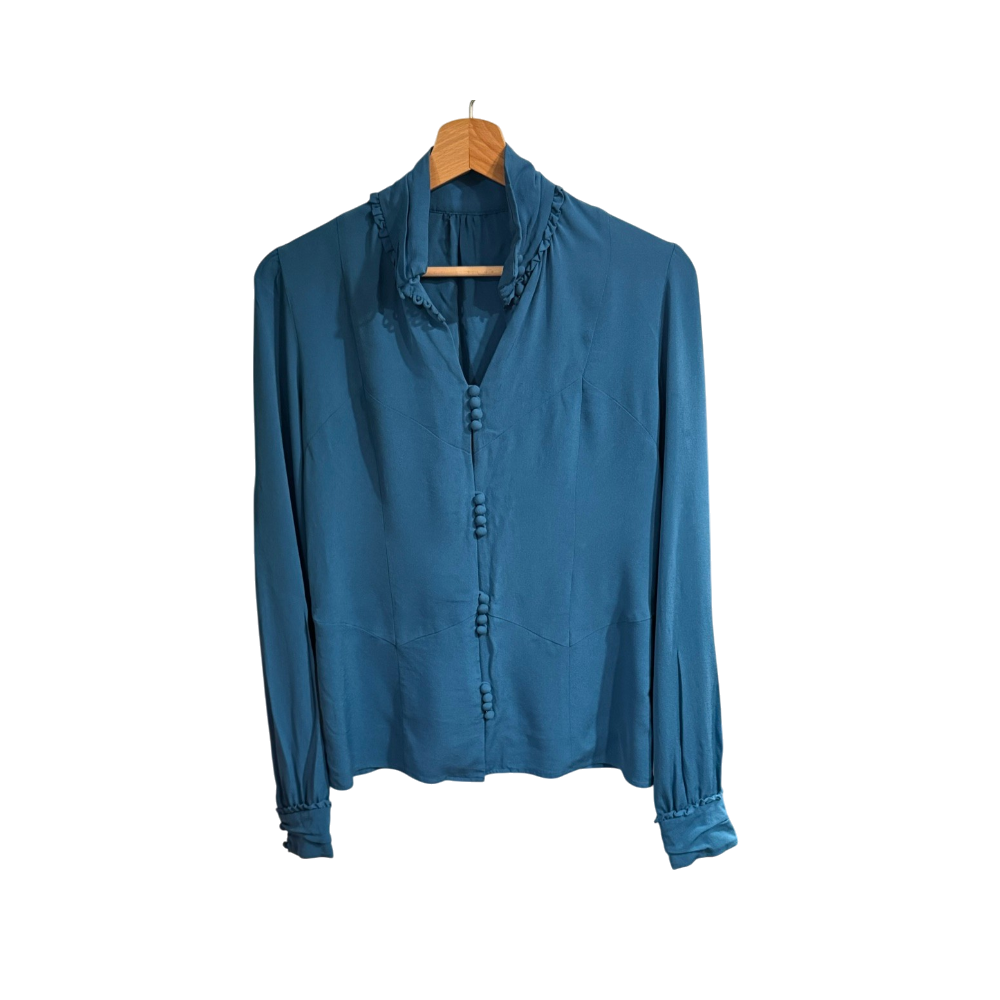 Teal blue button-front blouse with ruffled collar and cuffs.