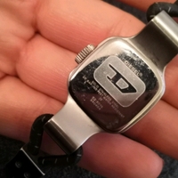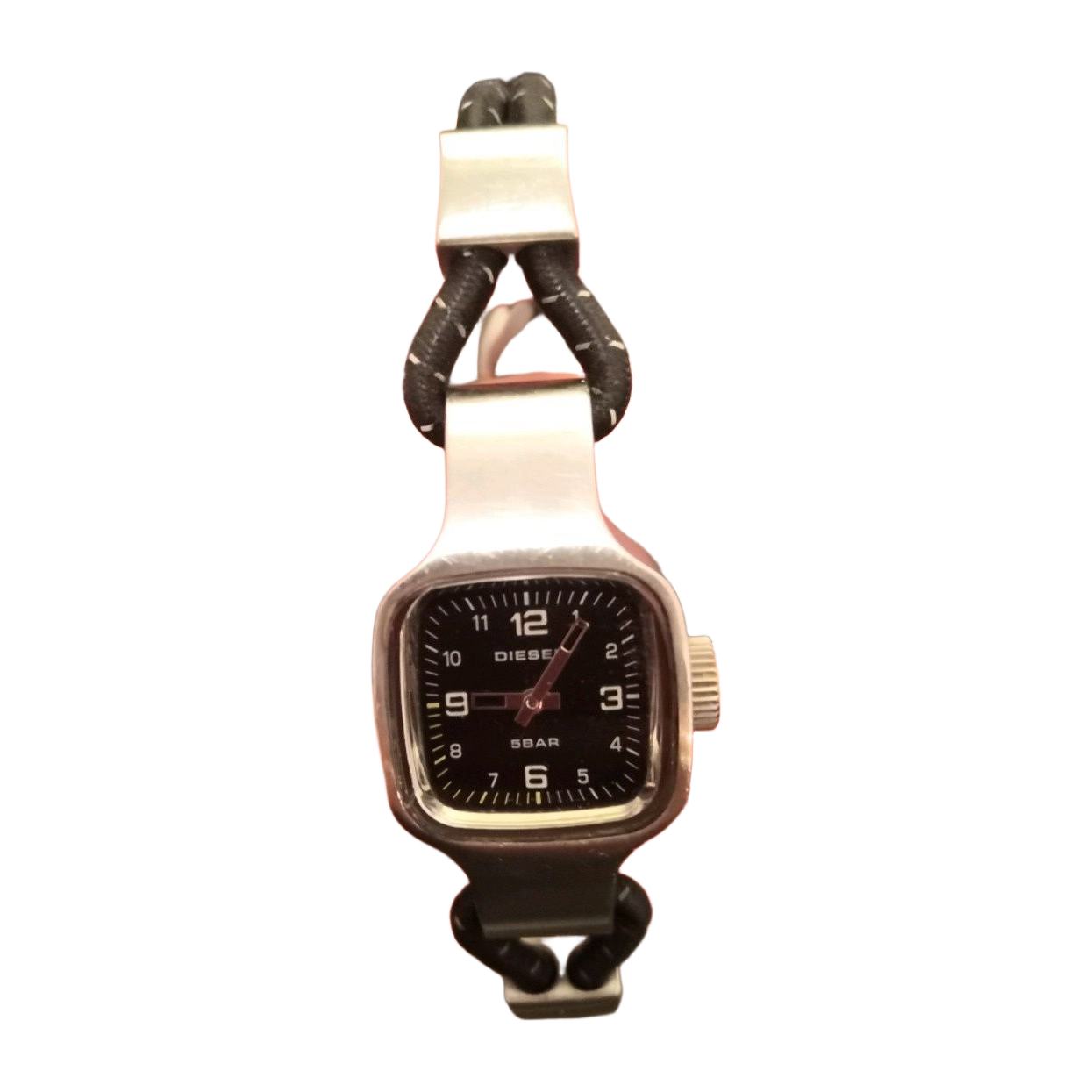 Erikoinen Dieselin rannekello. Erikoinen muotoilu ja rouheudesta huolimatta siron näköinen. Muutamia käytönjälkiä metalliosissa.Jäänyt itsellä vähälle käytölle,valmiina muuttamaan uuteen kotiin jossa pääsisi useammin näytille.Patterin vaihdon tarvii.
