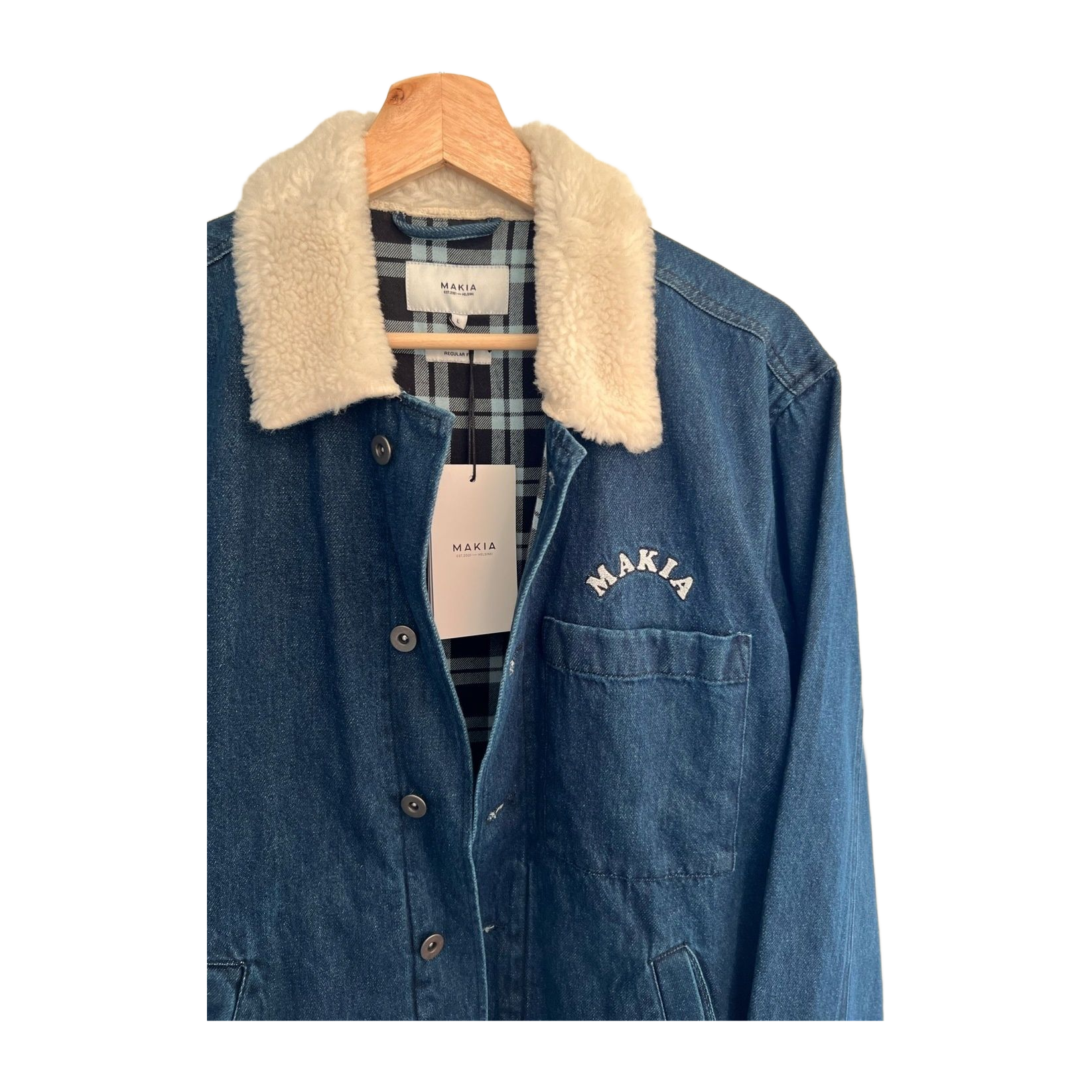 Miesten L-kokoinen käyttämätön farkkutakki, laput kiinni. Selässä Mauri Kunnaksen suunnittelema printti.