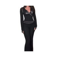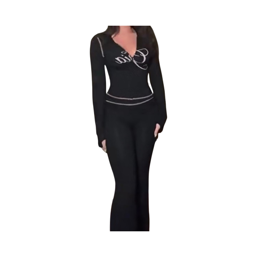 Matalavyötäröiset mustat bootcut-housut, vaaleanpunaisella kirjonnalla.