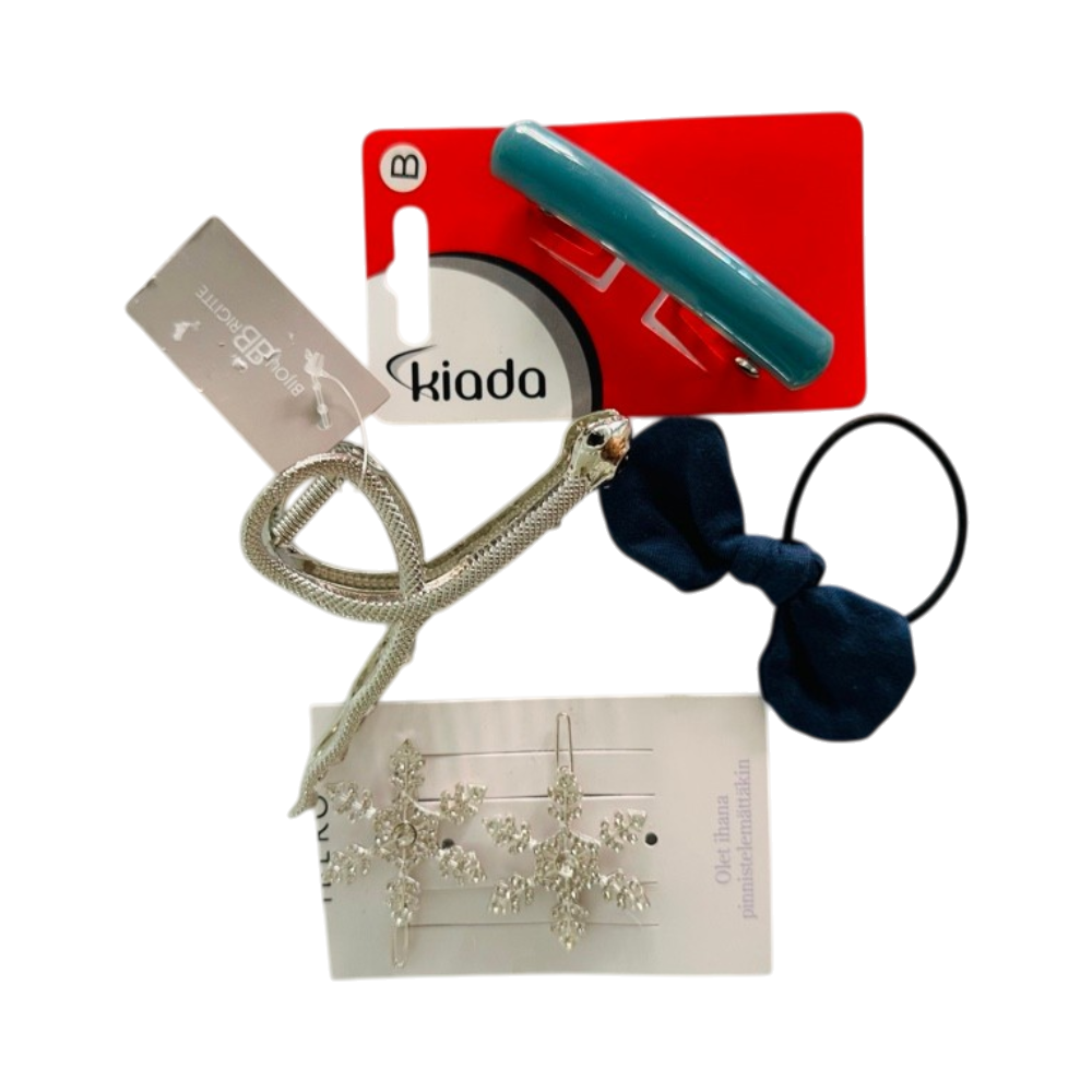 Moniosainen hiussetti: ponnari, klipsi, soljet x 3, kaikki käyttämättömiä, useita brändejä (Ibero, Brigitte ym.)