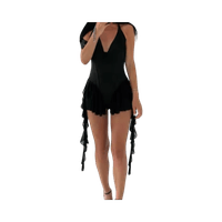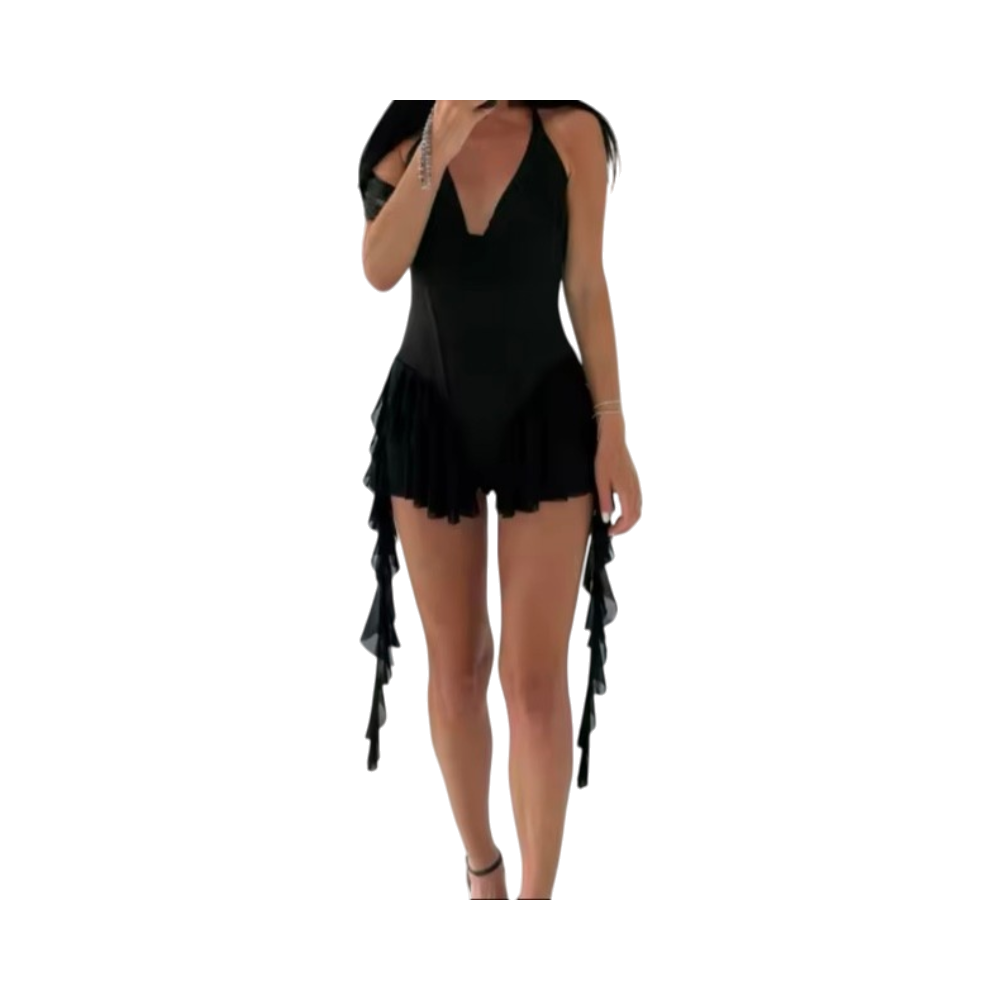 Syvään uurrettu uimapuku, röyhelömäinen hame, koristehapsut. Korea merkkiä.