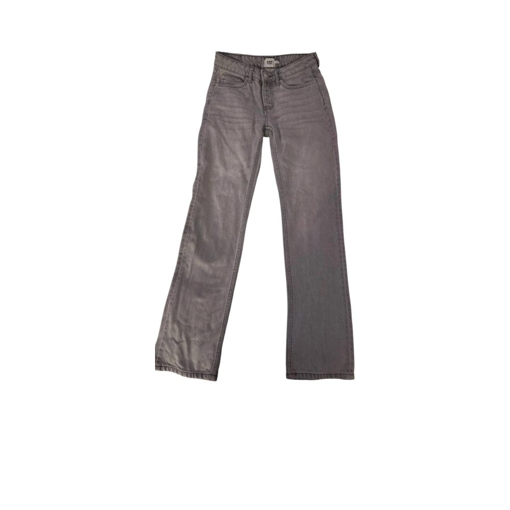 Harmaat suoralahkeiset farkut, vyötäröllä napitus.