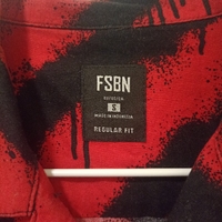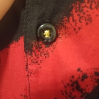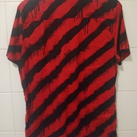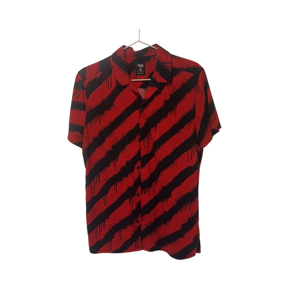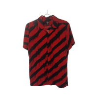 Punamusta raidallinen lyhythihainen kauluspaita, hyväkuntoinen. Koko S. Ylin nappi ommeltu uudelleen kiinni.