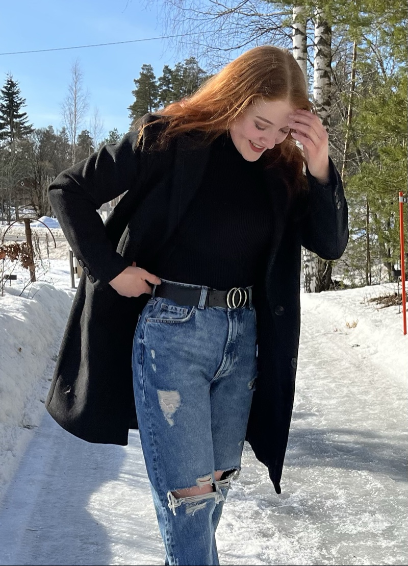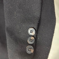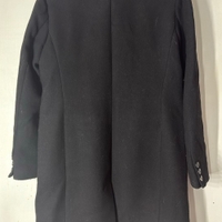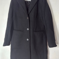 Elloksen musta polvipituinen villakangastakki, koossa 38. Kiinnitys kolmella napilla ja kaksi taskua. Hihoissa nappikoristeet.