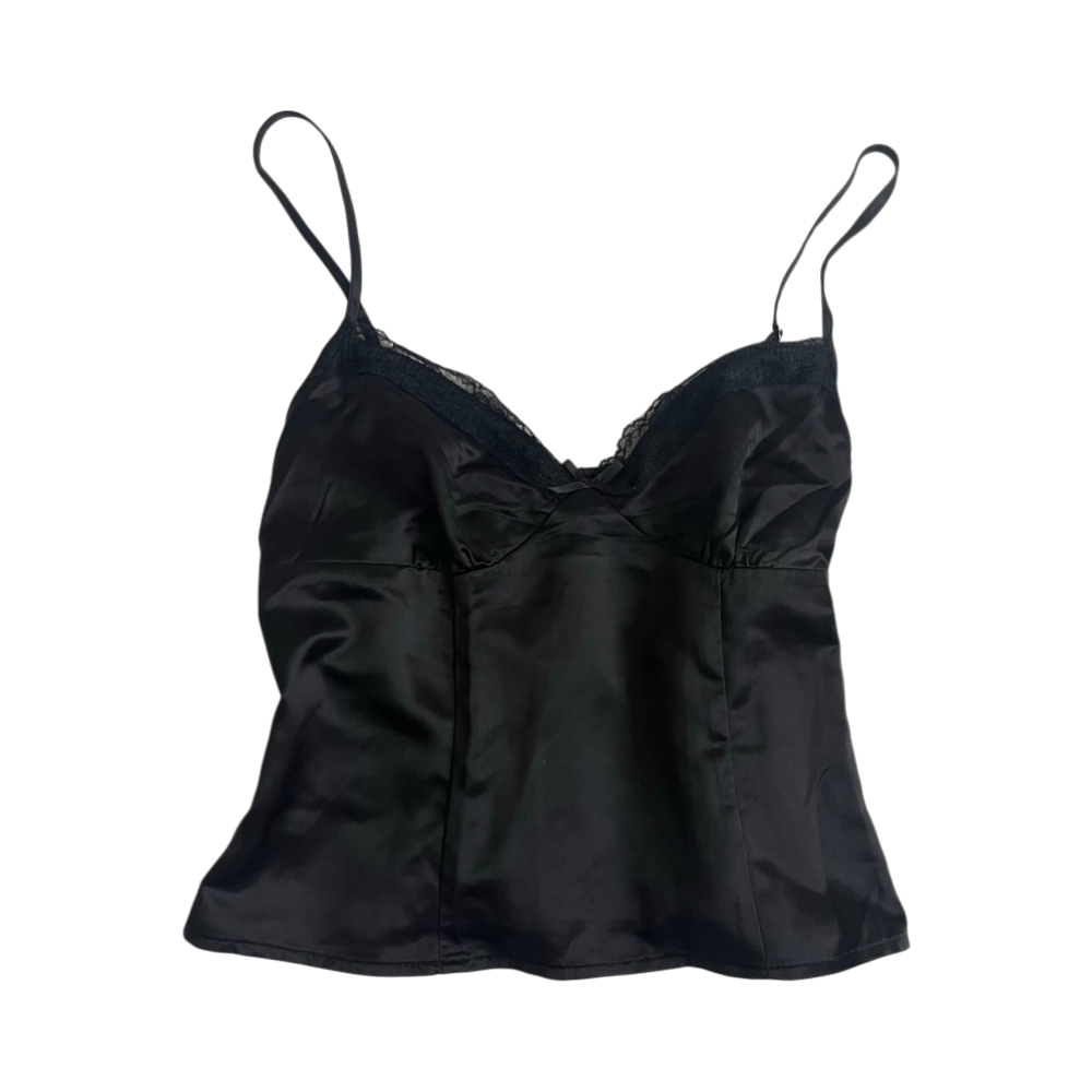 Musta satiininen hihaton toppi, pitsireunus ja säädettävät olkaimet. Sivulla piilovetoketju.