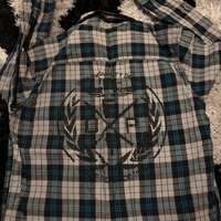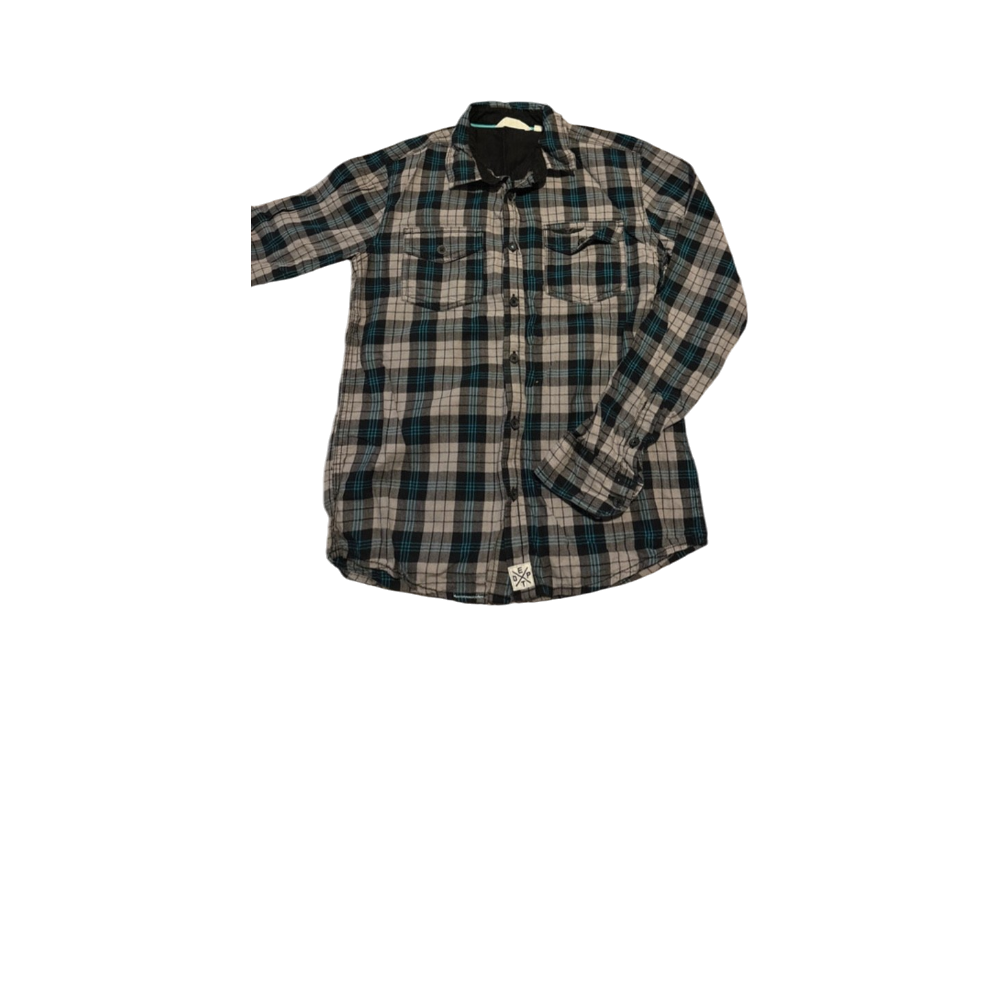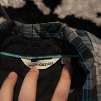 Harmaansininen ruudullinen pitkähihainen kauluspaita. Takana kuva