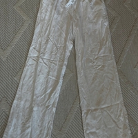 Keveät leveälahkeiset housut, kuminauha ja nyörisyöttö.