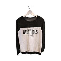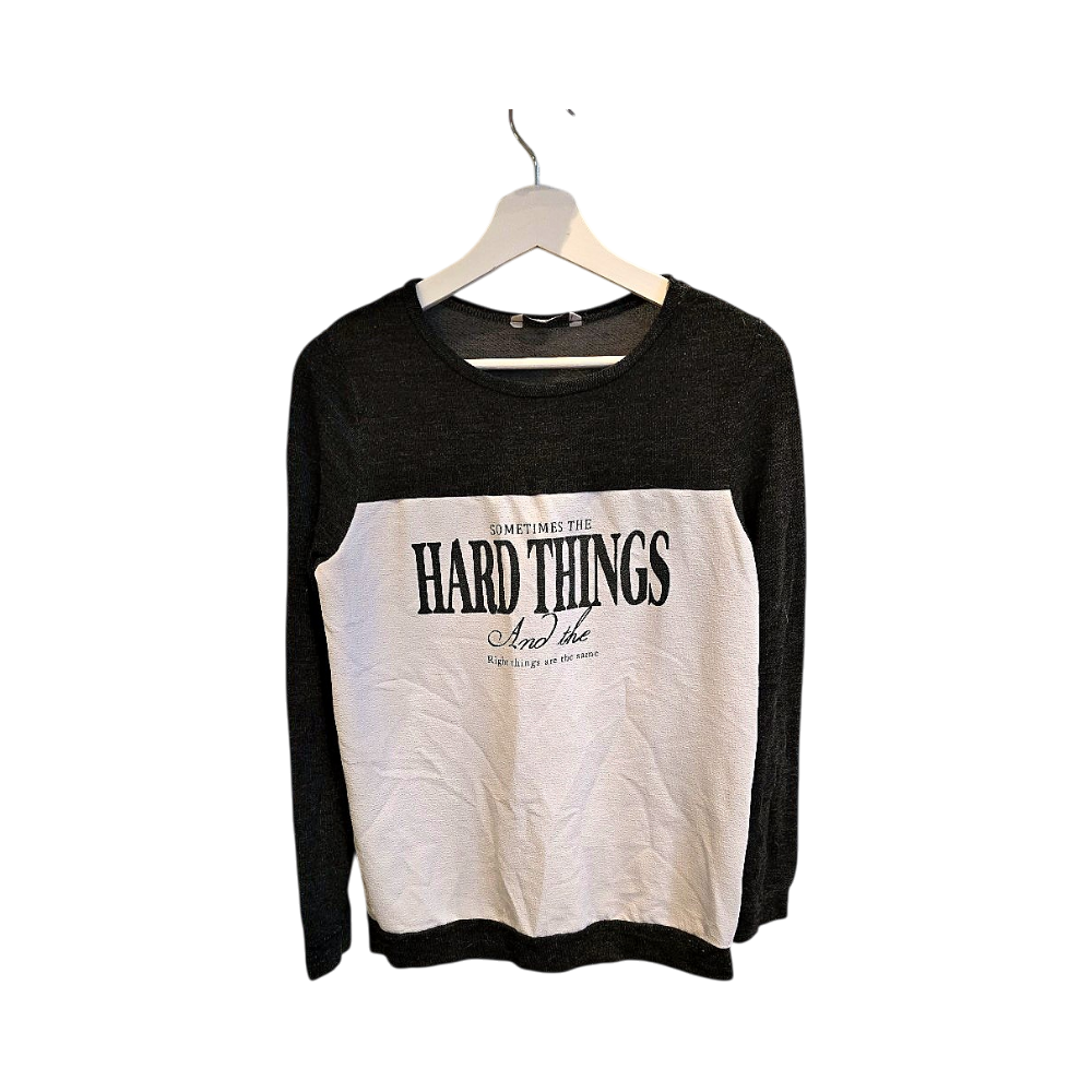 Pitkähihaisen puseron teksti edessä, rento istuvuus.
