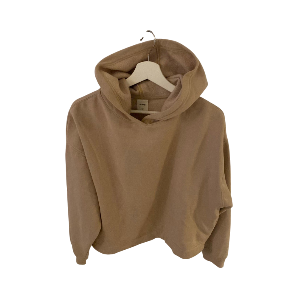 Beige cropped-huppari, pehmeä fleece-vuori, rento istuvuus.