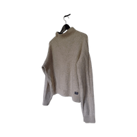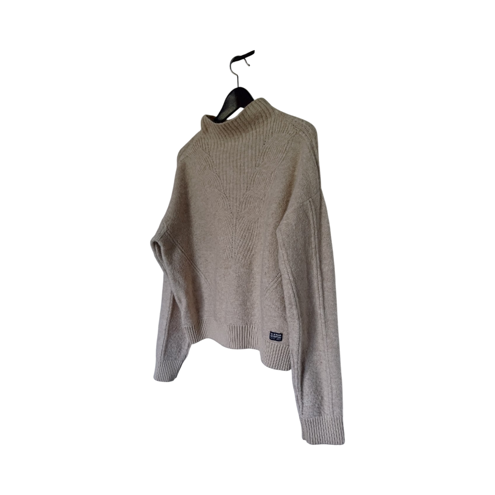 Over size beige neulepaita, jossa korkea ribbineuloskaulus ja koristekuvio edessä. Alareunassa kangasmerkki, jossa lukee: G-star originals RAW DENIM. Pehmeä ja lämmin.