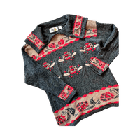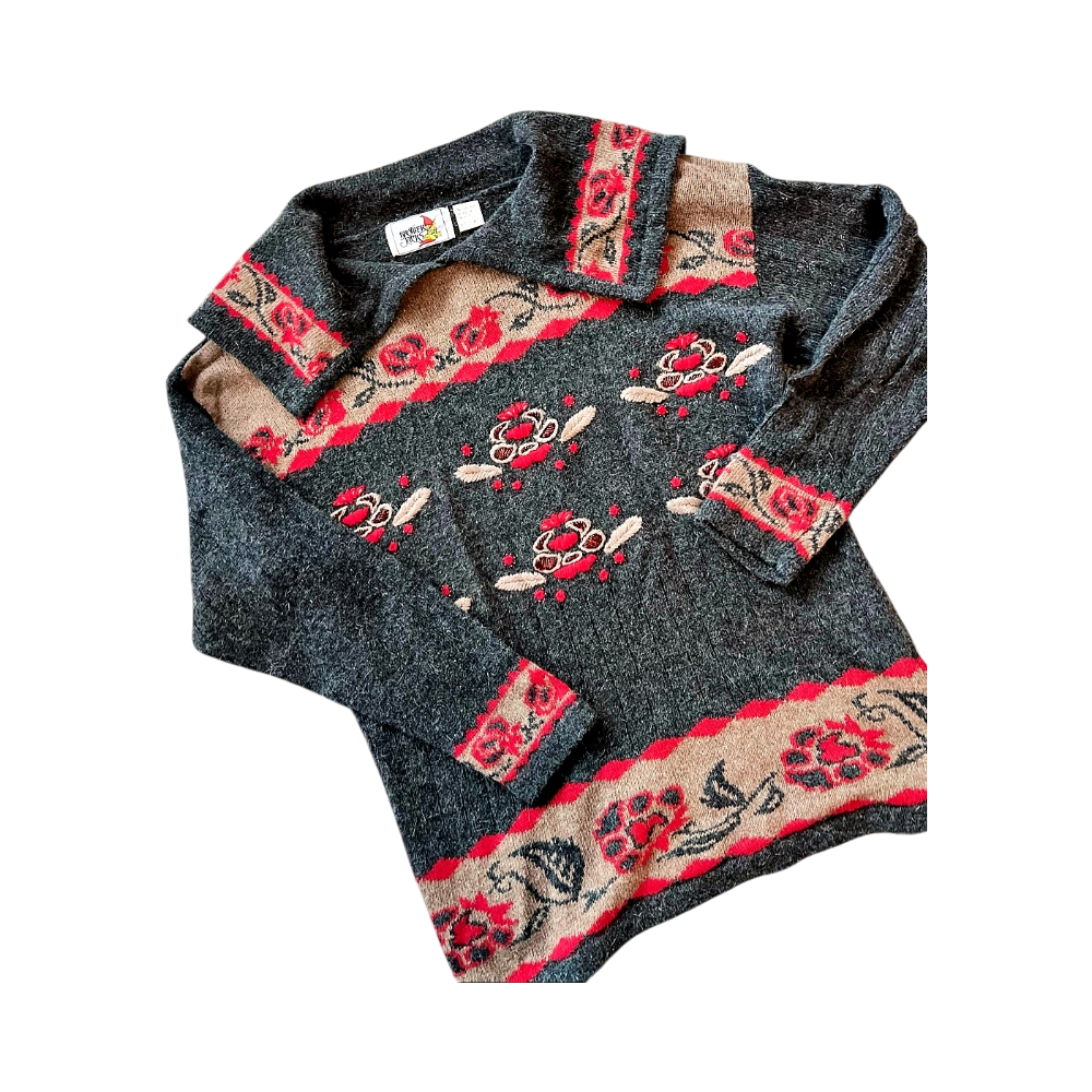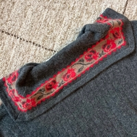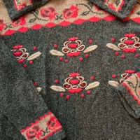Todella pehmoinen harmaa kirjailtu villapaita, angorasekoitetta. Sopii arviolta koossa s-l. Pituus 75cm ja kai kai mitta noin 53cm. Siistissä kunnossa