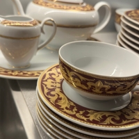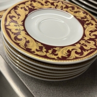 Astioissa on valkoinen lasite ja punainen/ruskea koristeellinen kuvio kultaisilla yksityiskohdilla.