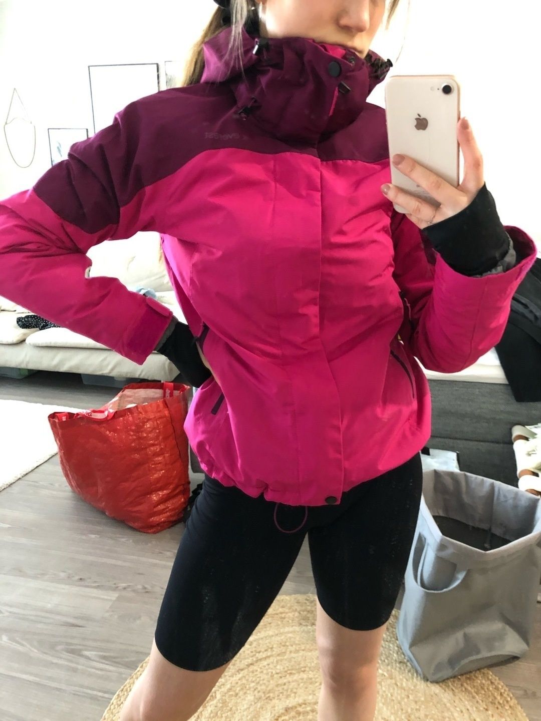Everestin pari kertaa päällä ollut laskettelutakki. Lumistopparit ja korttitaskut löytyy.