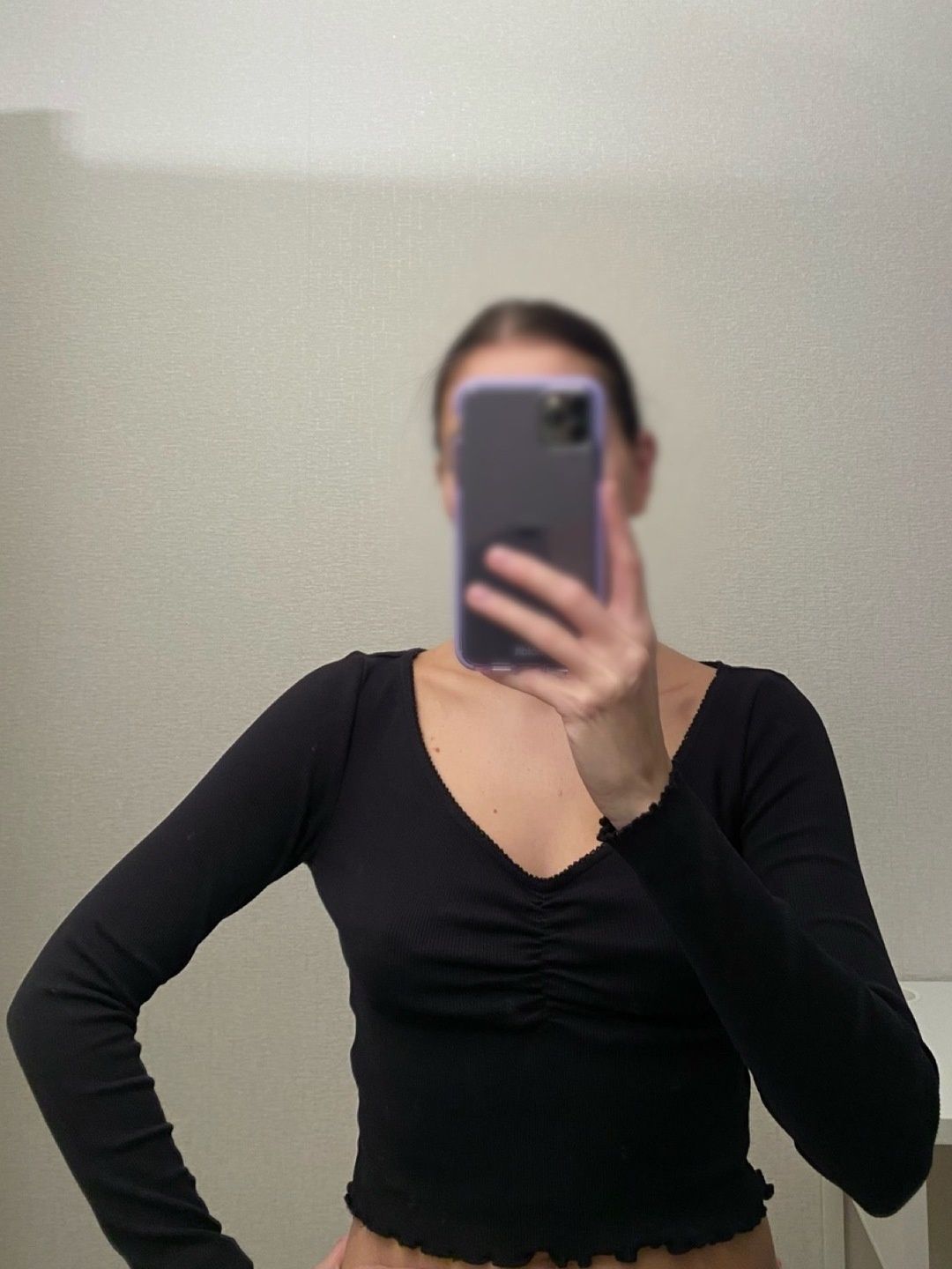 Monkin musta pitkähihanen pienellä rypytyksellä edessä.