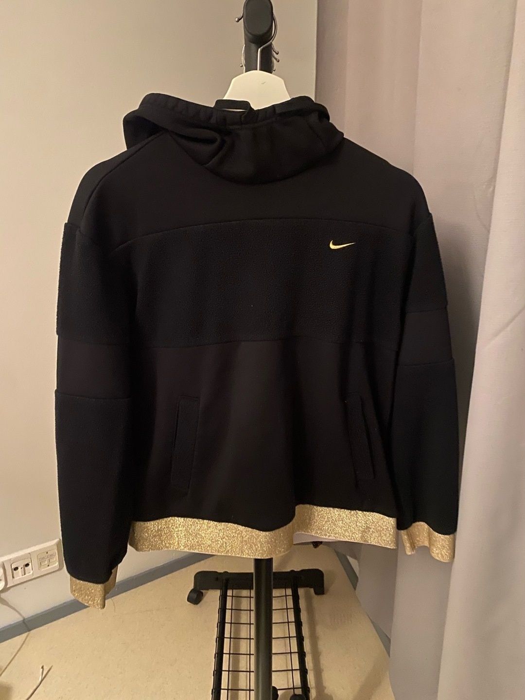Niken musta huppari jossa keskellä fleece vuorta ja kultaiset yksityis kohdat . Muutamasti pidetty.